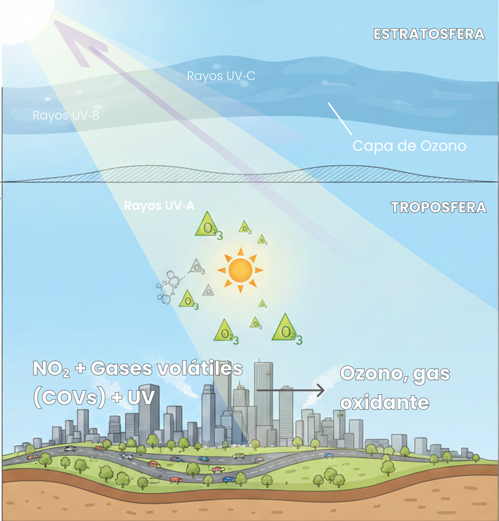 Mientras que el ozono estratosférico actúa como nuestro escudo vital contra la radiación UV-B y UV-C, a nivel del suelo se convierte en un agresor molecular.